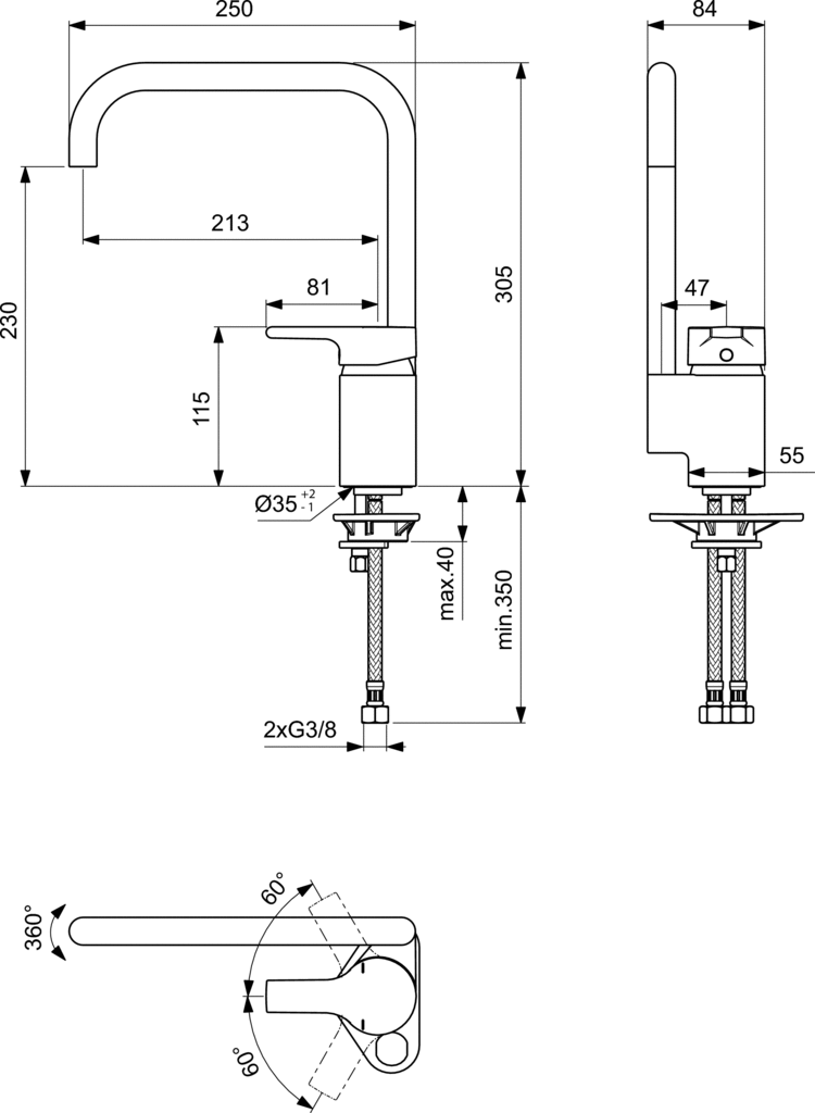 Active kuchynská batéria  s vysokým vývodom a s otočným ramenom a krytým prlátorom DN15. Vývod 213 mm. Výška vývodu 230 mm. S flexibilnými hadicami G3/8. Kovová ovládacia páka. Montáž zospodu - upevnenie EASY FIX s centrovacím a tiesniacim krúžkom. CLICK-kartuša Ø 40 mm s keramickými diskami. Pivot kartuše z nerezovej ocele. Integrovaný obmedzovač teplej vody + ECO funkcia. Životnosť testovaná podľa EN 817. Ochrana proti hluku DIN 4109, trieda 1.