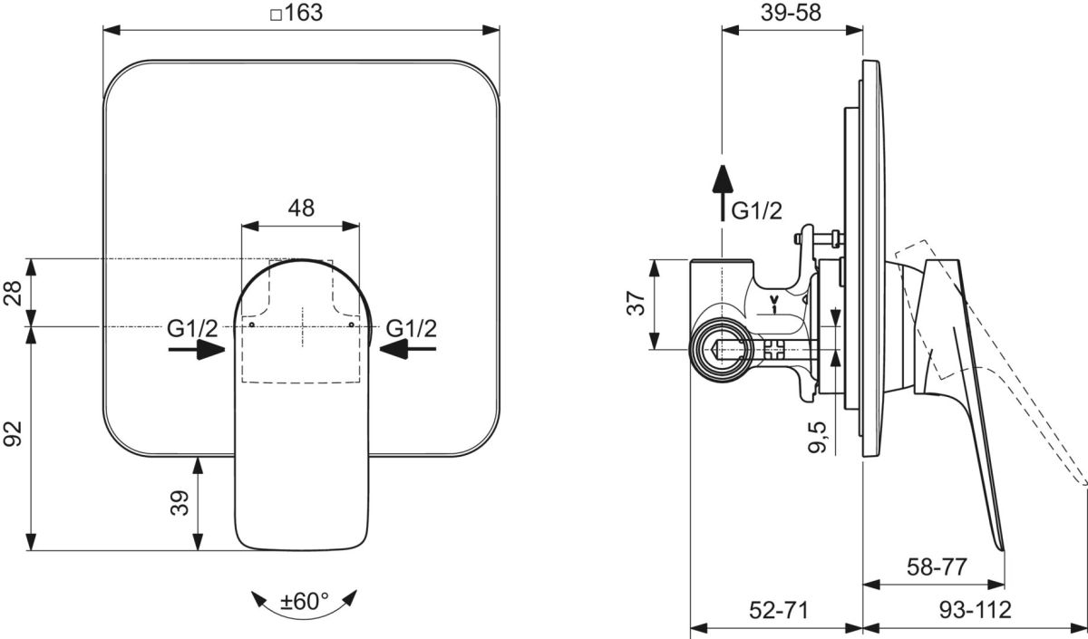 Sprchová batéria podomietková. Rozeta štvorec 163 mm. Kovová ovládacia páka so značením teplá/studená. Chrómová rozeta plast. Kartuša Ø 47 mm s keramickými diskami a obmedzovačom teplej vody. Bez prepínača. Testované podľa EN 817. Sprchová batéria (diel 2) vrátane podomietkového dielu (diel 1)