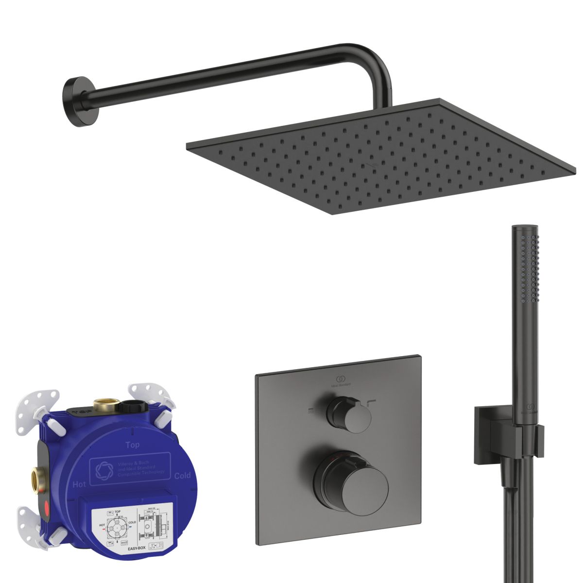 CeraTherm C100 sprchový podomietkový systém s termostatom komplet farba povrchu Magnetic Grey. Skladá sa z univerzálného podomietkového dielu D1, s termostickej podomietkovej batérií D2, hlavovej kovovej sprch 300x300 mm, 1-funkčná ručná sprcha mikroón, držiak hlavovej sprchy 40 cm, pripojovacie kolienko hranaté s držkiakom pre ručnú sprchu, hadica IdealFlex 170cm. So zariadením na zamedzenie zpätného toku. Cool Body technológia. Termostatická kartuša s rozťažitelnou voskovou súčiástkou. Funkcia Anti-Kalk. Regulácia teploty s ochranou proti obareniu. Obmedzovač teploty (detská poistka). Blokovacie Eco tlačítko k obmedzeniu prietoku vody. Ochrana proti hluku DIN 4109, trieda 1.