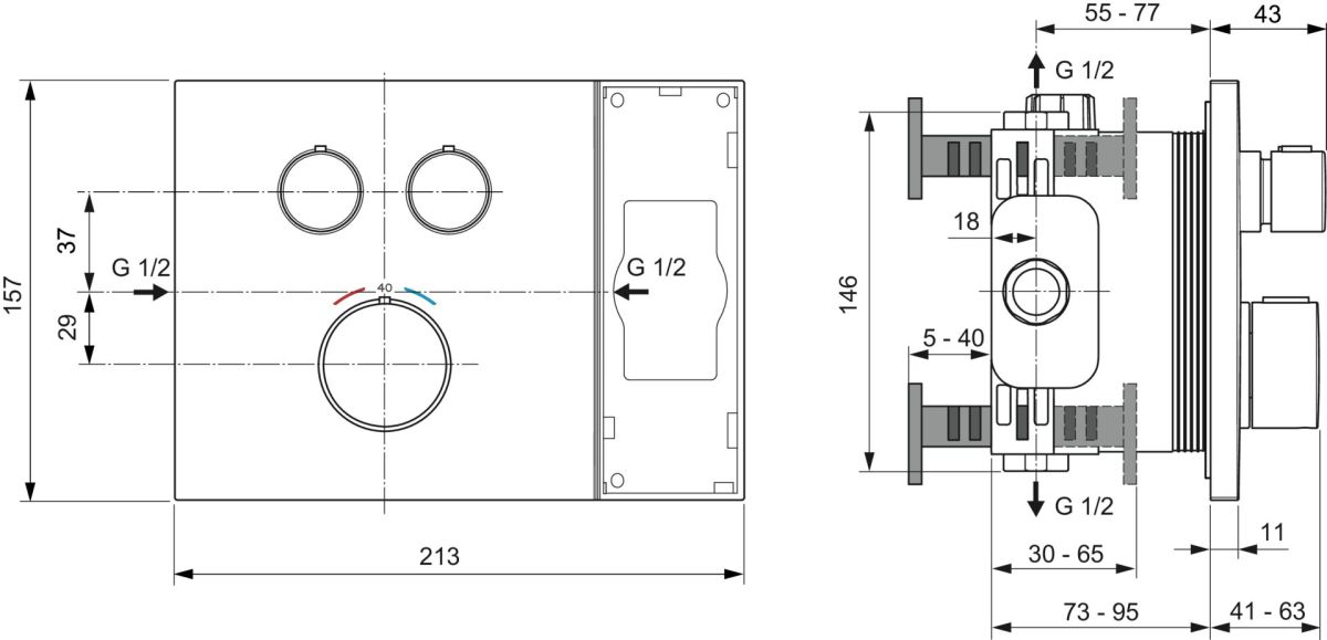 CeraTherm Navigo Solos Sprchová termostatická podomietková batéria farba povrchu chróm, pre kombináciu s 3-Funkčnou hlavovou sprchou Solos Diel 2 (vonkajšia časť). Termostatická kartuša PreciTherm® pre presnú reguláciu teploty. Kovová teplotná rukoväť s potlačením zastavenia teploty na 40 °C (nastavené z výroby). Nezávislé tlačidlá NAVIGO® pre ručnú a hlavovú sprchu a ovládanie množstva vody: - Zapnutie/vypnutie stlačením - Nastavenie prietoku otáčaním Jednoduché ovládanie vďaka ergonomickým rukovätiam a dostatočnej vzdialenosti medzi ovládacími prvkami. Štvorcová tenká kovová rozeta s odolným povrchom as možnosťou umiestnenia diaľkového ovládania pre 3-funkčnú sprchovú hlavicu Solos. Držiak rozety s integrovaným tesnením, voda nepreniká do stien. Integrovaná ochrana proti spätnému toku. Malá vzdialenosť od steny zaisťuje ďalší voľný priestor pri sprchovaní. Diaľkové ovládanie nie je súčasťou dodávky, dodáva sa s 3-Funkčnými hlavovými sprchami Solos 3-F A7889AA, A7890AA, A7891AA. Zodpovedá norme EN1111. Možno použiť iba v kombinácii s telesom A1000NU Diel 1 (vnútorná časť).