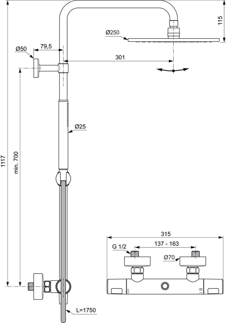 CeraTherm T25 sprchový systém s termostatickou batériou so sprchovou nástennou termostatickou batériou CeraTherm T25. DN 15. Nová termostatická kartuša s vylepšenou technológiou nastavenia a kontroly teploty vody, regulácia teploty vody a ochrana proti obareniu. Štíhlejšie telo batérie Ø 41 mm so zdokonalenou technológiou CoolBody, vďaka nej telo termostatickej batérie zostane chladné po celom povrchu. Skryté S-prípojky s nízkou hlučnosťou (nastaviteľné od 137 - 163 mm). Funkcia AntiKalk - systém proti tvorbe vodného kameňa. Hlavová sprcha ABS Ø200 mm a 1-funkčná okrúhla ručná sprcha IdealRain Ø100mm. Funkcia Anti-Kalk (proti tvorbe vodného kameňa). Sprchová tyč s posuvným držiakom sprchy. Hadice "Idealflex" 1750 mm. Skryté pripojení G1/2. Obmedzovač teplej vody - detská poistka.Regulácia teploty s ochranou proti obareniu. Kovové ovládacia rukoväte. Ľavá pre reguláciu prietoku i teploty vody, pravá so zabudovaným prepínačom, pre prepínania medzi vaňou a sprchou. V súlade s EN 1111