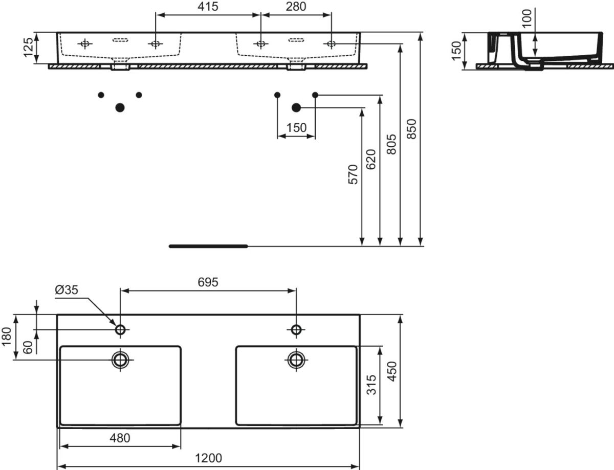 Dvojumývadlo nástenné 120 x 45 cm farba biela lesklá . S otvorom pre umývadlovú batériu. S prepadom štrbinový tvar. Brúsená spodná hrana - vhodné pre inštaláciu na dosku.