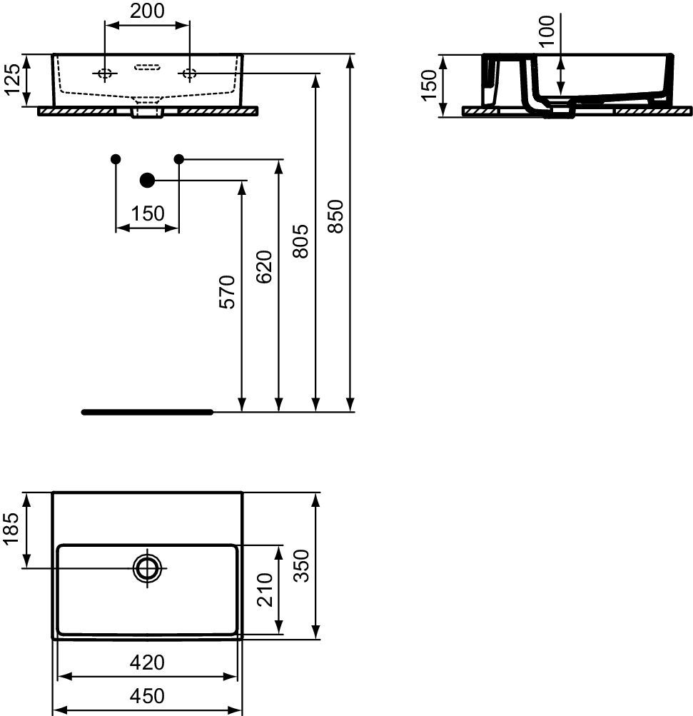 Umývadielko nástenné 45 x 35 cm farba biela lesklá s povrchovou úpravou ideal plus . Bez otvoru pre umývadlovú batériu. S prepadom štrbinový tvar. Brúsená spodná hrana - vhodné pre inštaláciu na dosku.