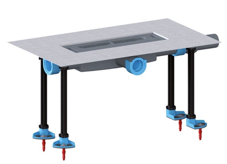 HL53KF Teleso vpustu do vnútorných priestorov, DN40 na montáž do plochy, alebo pri stene s integrovaným poterovým povrchom, odtokové potrubie je možné inštalovať vľavo, vpravo, alebo v strede , flexibilne nastavená tesniaca manžeta, výškovo nastaviteľné montážne nožičky a vyberateľný zápachový uzáver.