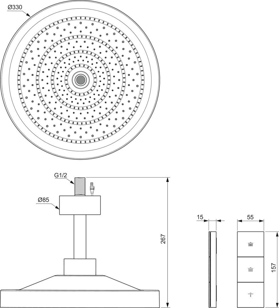 Idealrain Solos Hlavová farba povrchu chróm, sprcha 3-funkčná Ø 330 mm s LED svetlom a stropným pripojením 3-funkčná hlavová sprcha (Rain, Silkrain a 2nd skin ) Ø 300 mm s funkciou svetla - Plne silikónový povrch EasyClean bez medzier medzi tryskami a čelnou doskou zabraňuje usadzovaniu vodného kameňa a uľahčuje čistenie, s obmedzovačom prietoku 12 l/min. Svetlo sa aktivuje automaticky pomocou senzora prítomnosti - v okruhu 1,5 m pod sprchou sa svetlo rozsvieti. Svetlo zhasne po 1 minúte neprítomnosti. Teplé biele svetlo 4000 kelvinov. Možná integrácia do múdre domácnosti pomocou ZigBee 3.0 – umožňuje meniť farbu a jas svetla. Univerzálna diaľkový ovládač s 3 tlačidlami na prepínanie funkcií hlavovej sprchy - ľubovoľne polohovateľný, maximálna vzdialenosť od hlavovej sprchy 10 metrov; vodotesný: stupeň ochrany min. IP57; batériová prevádzka s bežne používanými typmi (gombíková batéria - CR2032); životnosť batérie: batéria s dlhou životnosťou (min. 4 roky alebo 20 000 zopnutí); Jednoduchá výmena batérie; červená kontrolka pred vybitím. Pripevnenie k stene 400 mm. G1/2“ vonkajší závit pripevnenia k stene - vyžaduje špeciálny Diel 1 (A1080NU) pre pripojenie vody a napájacieho kábla zo steny a na zaistenie pevného upevnenia. Nutné napájanie pre svetlenú sprchu. Napájací adaptér vo vnútri krabice prevádza 230 V AC na 24 V DC pre bezpečné použitie.