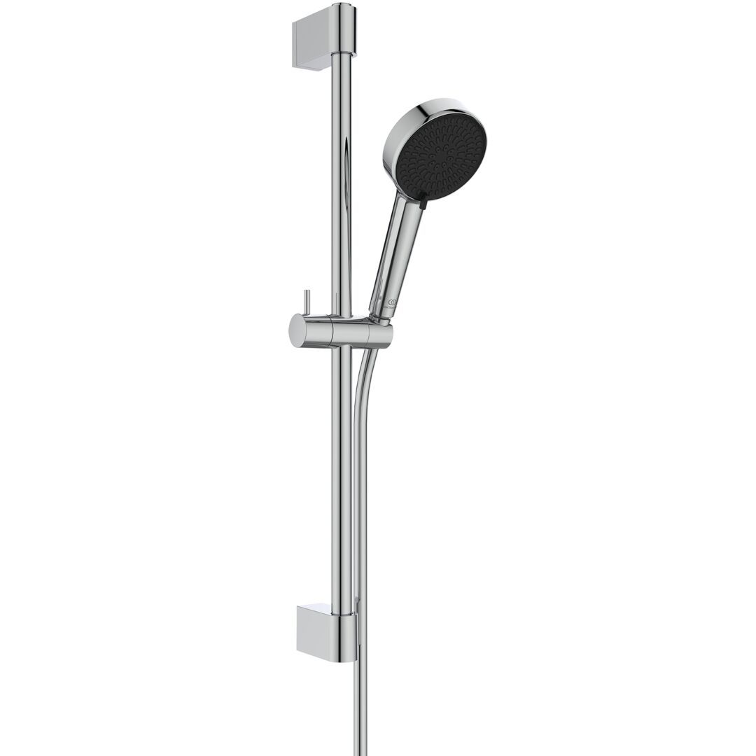IdealRain sprchový set s tyčou Tyč 60 cm, Ø 21 mm, s posuvným a otočným držiakom sprchy. Semi-Flex upevnenie pre jednoduchšiu montáž. 2-funkčná ručná sprcha (Rain, SilkRain) Ø 100 mm, 8 l/min. EasyClean silikónové čierne trysky na jednoduché čistenie. Sprchová hadica IdealFlex 1750 mm.