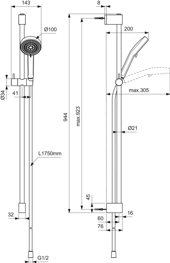 IdealRain sprchový set s tyčou Tyč 90 cm, Ø 21 mm, s posuvným a otočným držiakom sprchy. Semi-Flex upevnenie pre jednoduchšiu montáž. 2-funkčná ručná sprcha (Rain, SilkRain) Ø 100 mm, 8 l/min. EasyClean silikónové biele trysky na jednoduché čistenie. Sprchová hadica IdealFlex 1750 mm.