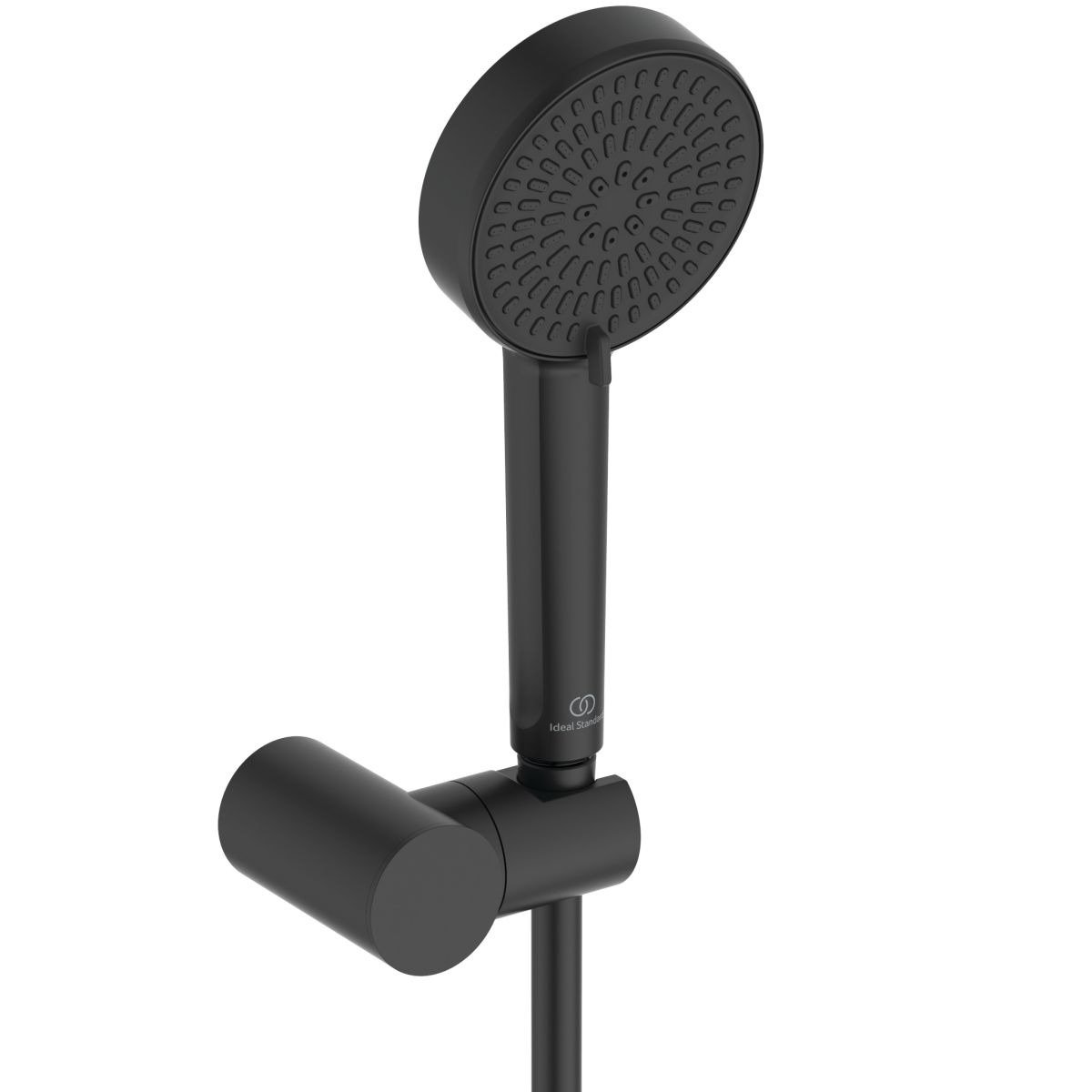 IdealRain sprchový set s otočným držiakom 2-funkčná ručná sprcha (Rain, SilkRain) Ø 100 mm, 8 l/min. EasyClean silikónové trysky čierne na jednoduché čistenie. Otočný držiak sprchy. Sprchová hadica IdealFlex 1250 mm.