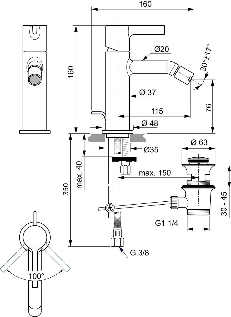 Joy bidetová batéria s odpadovou garnitúrou a flexibilnými hadicami. Povrchy: Technológia PVD A2 kartáčované zlato. Pevný vývod a perlátor. Vývod 115 mm. Výška vývodu 76 mm. S flexibilnými hadicami. Kovová ovládacia páka. Montáž zo spodu - upevnenie EASY FIX. Kartuša Ø35 mm s keramickými diskami. Rozsah otáčania páky 90°. Integrovaný zásobník maziva (vhodné pre potravinárské použitie). Integrovaný obmedzovač teplej vody. Životnosť testována podľa EN 817. Ochrana proti hluku DIN 4109, trieda 2.