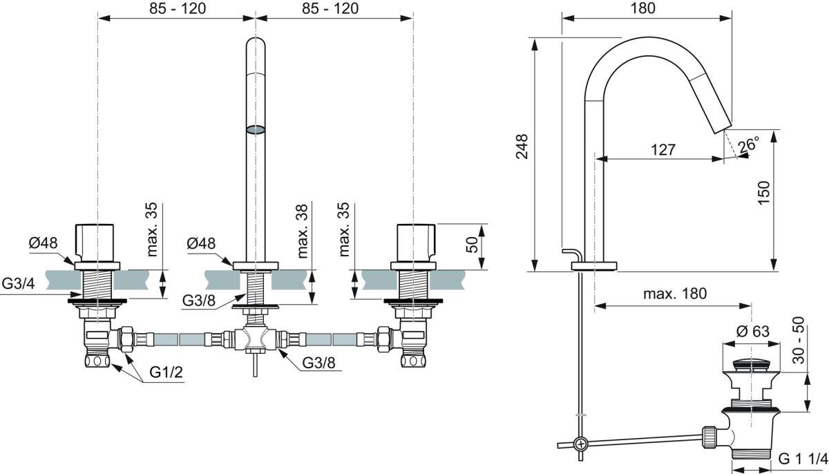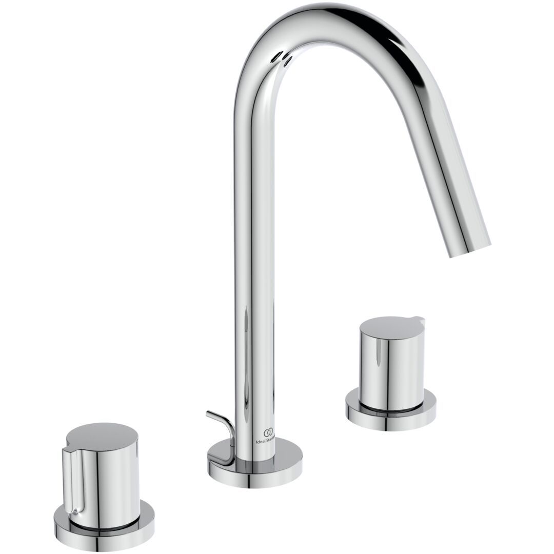 Joy umývadlová 3-otvorová batéria s odtokovou garnitúrou. Povrchy: Technológia galavnického chromovania. Ozdobná spodná časť tela. Rúrkový výtok s logom Ideal Standard. Ovládacie rukoväte bez označenia studená/teplá (modrá/červená potlač). Caché skrytý aerátor M16,5x1 s obmedzovačom prietoku vody na 5 l/min. Keramické ventily on-off (v smere a proti smeru hodinových ručičiek. Flexibilná hadica PEX G3/8” pre prívod vody. Kovová odtoková garnitúra.