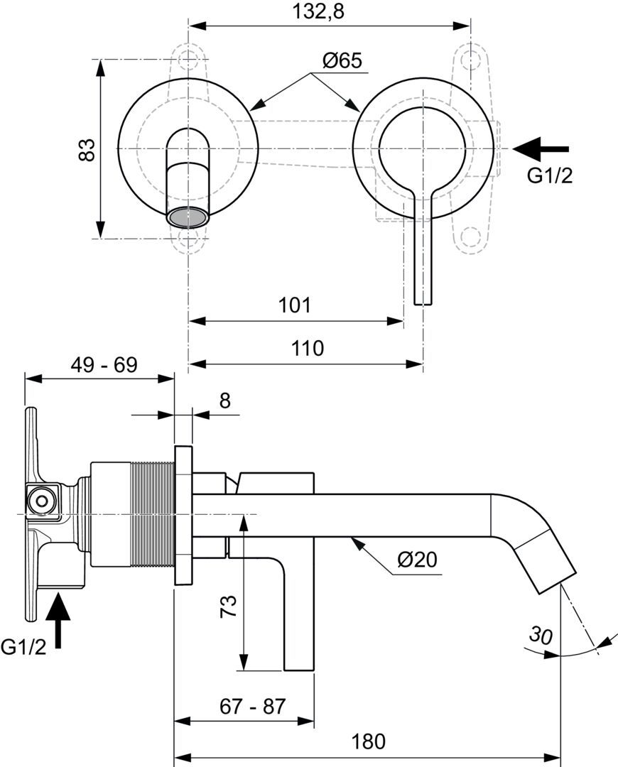 Joy umývadlová batéria podomietková. Diel 2 pre konečnú montáž (pohľadový diel). Kartuša FirmaFlow® Ø 28 mm s keramickými diskami, s obmedzovačom teplej vody, bez Click funkcie. Dĺžka výtoku 180 mm. Kovová rozeta s logom Ideal Standard. Kovová ovládacia páka, bez označenia studená/teplá (modrá/červená potlač). Caché skrytý aerátor M16,5x1 s obmedzovačom prietoku vody na 5 l/min.