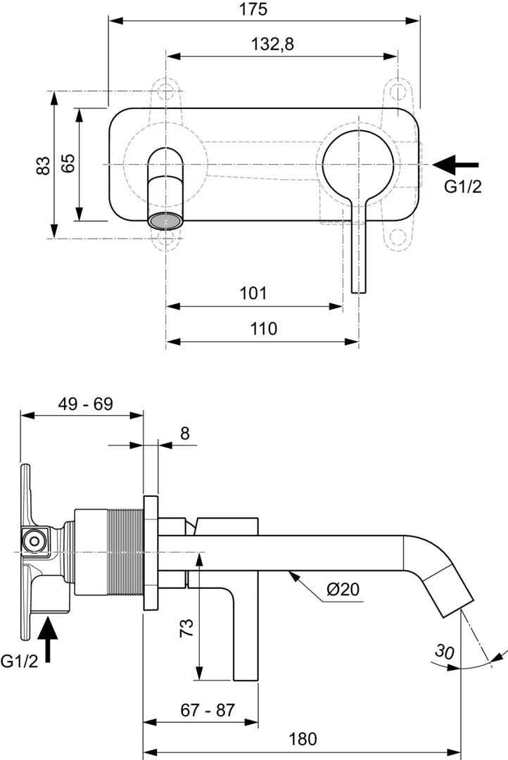 Joy umývadlová batéria podomietková. Diel 2 pre konečnú montáž (pohľadový diel). Kartuša FirmaFlow® Ø 28 mm s keramickými diskami, s obmedzovačom teplej vody, bez Click funkcie. Dĺžka výtoku 180 mm. Kovová rozeta s logom Ideal Standard. Kovová ovládacia páka, bez označenia studená/teplá (modrá/červená potlač). Caché skrytý aerátor M16,5x1 s obmedzovačom prietoku vody na 5 l/min.