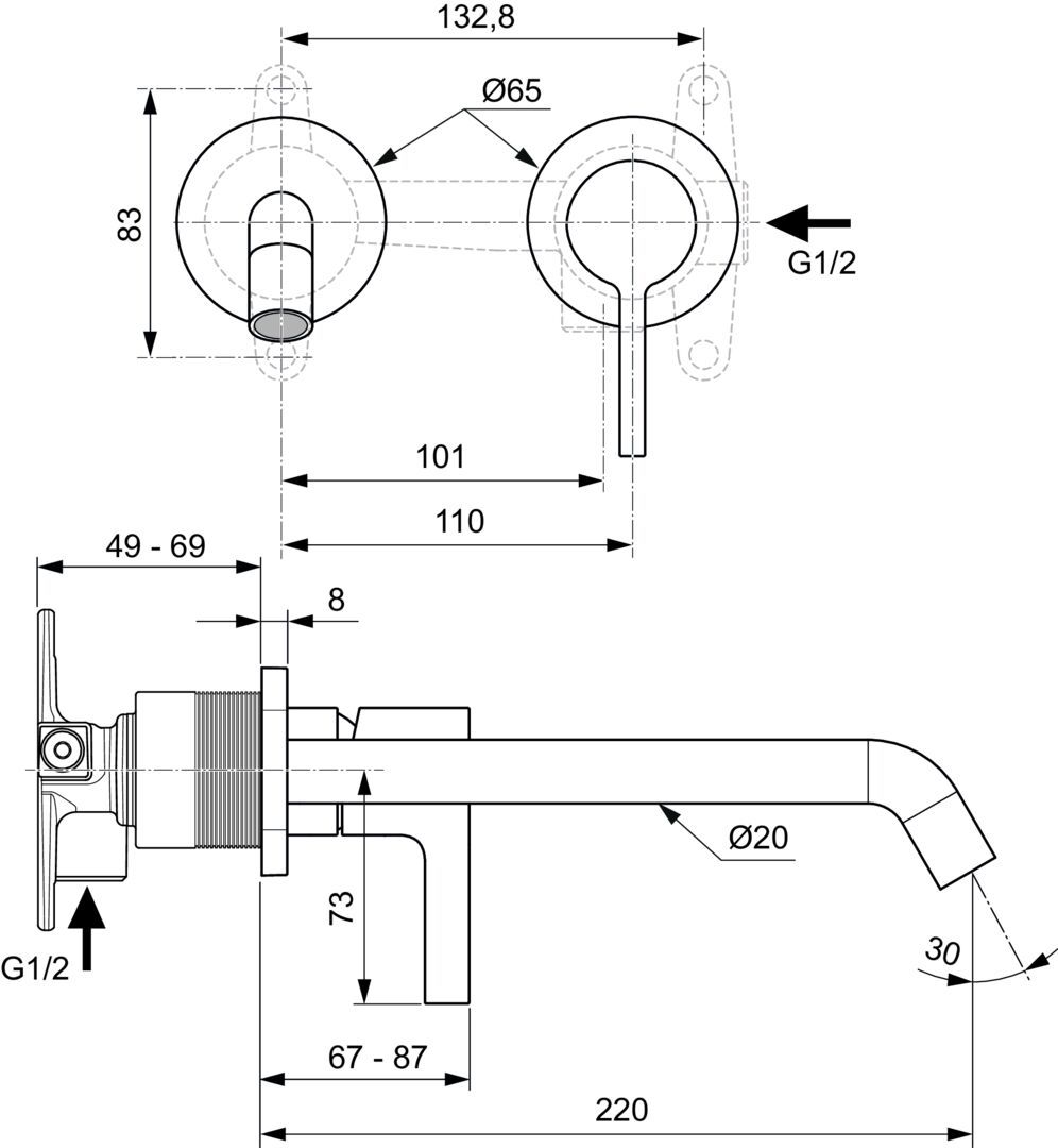 Joy umývadlová batéria podomietková. Diel 2 pre konečnú montáž (pohľadový diel). Kartuša FirmaFlow® Ø 28 mm s keramickými diskami, s obmedzovačom teplej vody, bez Click funkcie. Dĺžka výtoku 220 mm. Kovová rozeta s logom Ideal Standard. Kovová ovládacia páka, bez označenia studená/teplá (modrá/červená potlač). Caché skrytý aerátor M16,5x1 s obmedzovačom prietoku vody na 5 l/min.