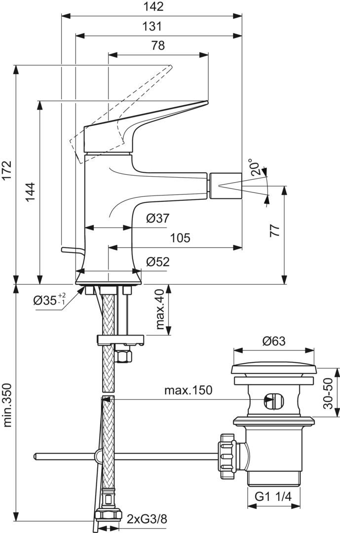 Bidetová batéria s odtokovou garnitúrou 28 mm FirmaFlow keramická kartuša s obmedzovačom teplej vody Ideal Standard logo na tele Kovová páka bez značenia teplá/studená Perlátor M16x1 s guľovým pripojením 5l/min Easy Fix inštalácia Flexibilná hadica PEX G3/8“ Odtoková garnitúra kovová Zodpovedá norme EN817