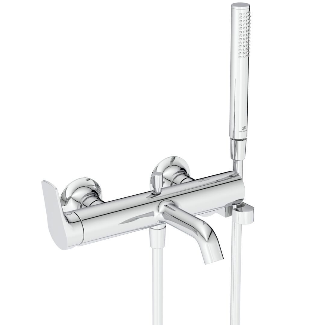 Vaňová batéria nástenná s príslušenstvom 38 mm FirmaFlow keramická kartuša s obmedzovačom teplej vody Ideal Standard logo na tele Kovová páka bez značenia teplá/studená spätný ventil S-prípojky s obmedzovačom hluku Perlátor M24x1 automatický prepínač Príslušenstvo: Idealrain Stick okrúhla ručná sprcha 8 l/min Sprchová hadica Idealfl ex 1250 mm Pevný nástenný držiak