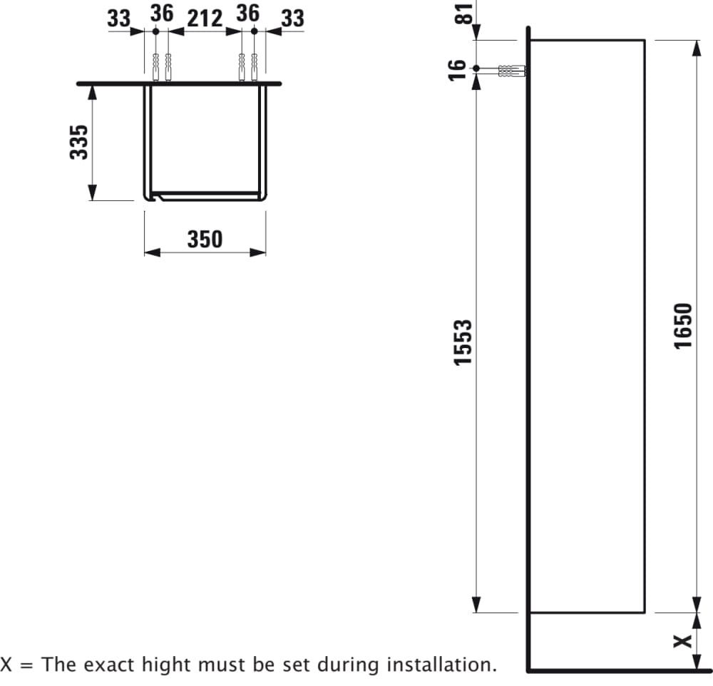LAUFEN BASE Vysoká skrinka, 1 dvierka, závesy vpravo, s držiakom z tmavého hliníka, 350x335x1650 mm, Biela lesklá 261, H4030341102611