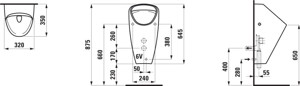 LAUFEN CAPRINO Odsávací pisoár rimless so senzorom, bez otvorov pre poklop, vnútorný odtok vody DN50, vrátane 1-litrového sifónu, antivandal, batériové napájanie (9 V) vrátane Bluetooth modulu, H8410667574011