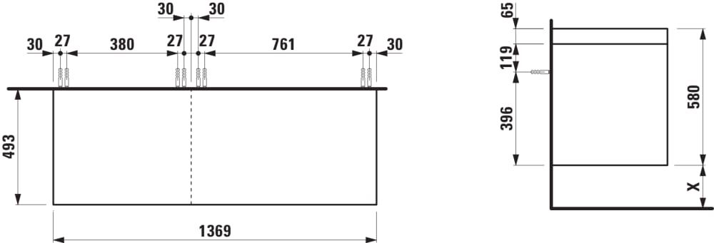 LAUFEN LANI Modulárna zostava 1400, umývadlová doska 65 mm (.260 šedá traffic), bez výrezu, so 2 zásuvkami: zásuvkový element 800 pravý + zásuvkový element 600 ľavý, 1370x495x580 mm, Biela matná 260, H4055811122601