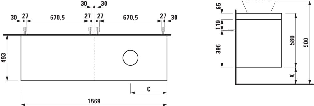 LAUFEN LANI Modulárna zostava 1600, umývadlová doska 65 mm (.260 šedá traffic), s výrezom vpravo, so 2 zásuvkami: zásuvkový element 800 pravý + zásuvkový element 800 ľavý, 1570x495x580 mm, Biela matná 260, H4055931122601