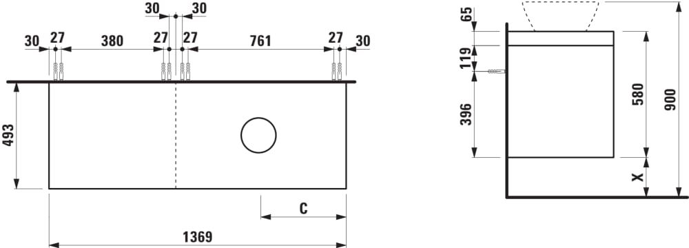 LAUFEN LANI Modulárna zostava 1400, umývadlová doska 65 mm (.267 divoký dub), s výrezom vpravo, so 2 zásuvkami: zásuvkový element 800 pravý + zásuvkový element 600 ľavý, 1370x495x580 mm, Šedá traffic 266, H4065831122661