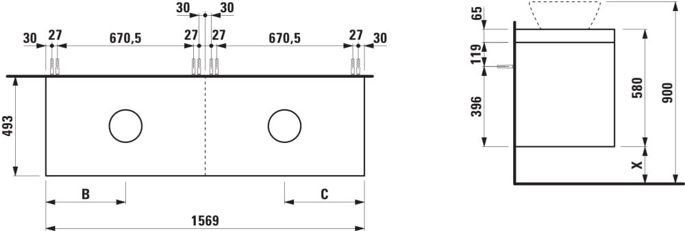 LAUFEN LANI Modulárna zostava 1600, umývadlová doska 65 mm (.267 divoký dub), s výrezom vľavo a vpravo, so 2 zásuvkami: zásuvkový element 800 pravý + zásuvkový element 800 ľavý, 1570x495x580 mm, Multicolour farby 999, H4065941129991