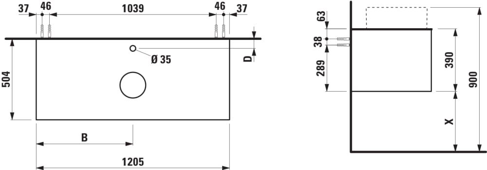LAUFEN ARUN Zásuvkový element 1200, s 1 zásuvkou, s výrezom uprostred, s vrchnou doskou Piasentina Grigio vr. otvoru pre batériu, 1205x505x390 mm, Noce Canaletto – drevená dyha 630, H4161251516301