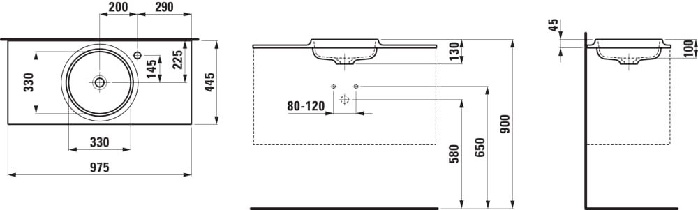 LAUFEN LANI Umývadlo do nábytku 'slim', materiál Marbond s armatúrovou doskou vpravo, s jedným otvorom pre batériu vpravo, bez prepadu, 977x445 mm, farba Biela matná, H8140757571141