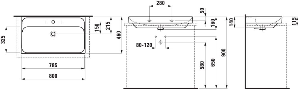 LAUFEN MEDA Umývadlo, brúsená spodná časť umývadla s tromi otvormi pre batériu, bez prepadu, 800x460 mm, farba Čierna matná, H8161177161581