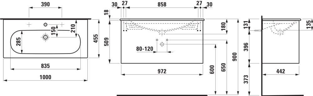 LAUFEN LUA Umývadlo slim so skrinkou 'Lani' 100 cm, s 2 zásuvkami, 1000x455x525 mm, Špeciálne farby 990, H8600889901071