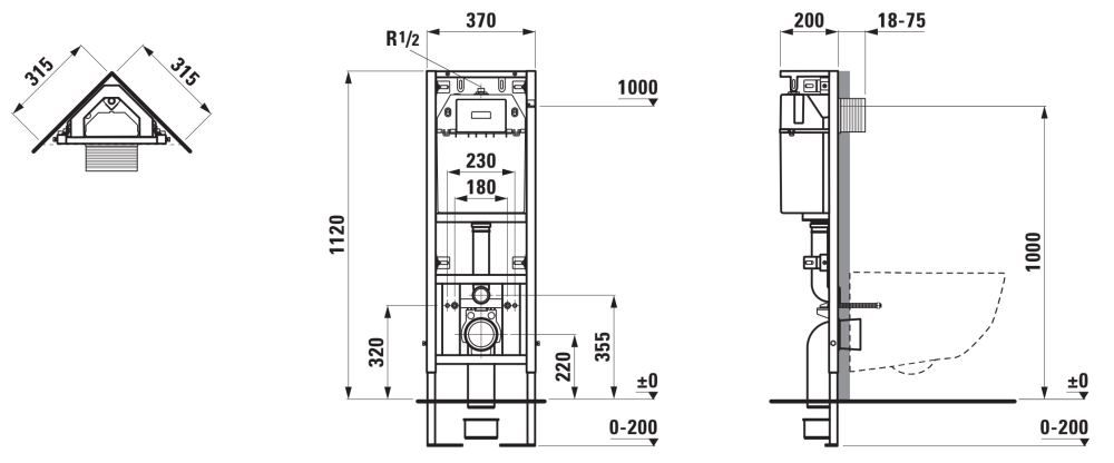 LAUFEN INEO Rámový podomietkový modul pre rohovú montáž, pre závesné WC, do ľahkej priečky, Dual Flush 6/3 l, nastaviteľné aj na 4,5/3 l, s nádržkou proti oroseniu, H9201190000001