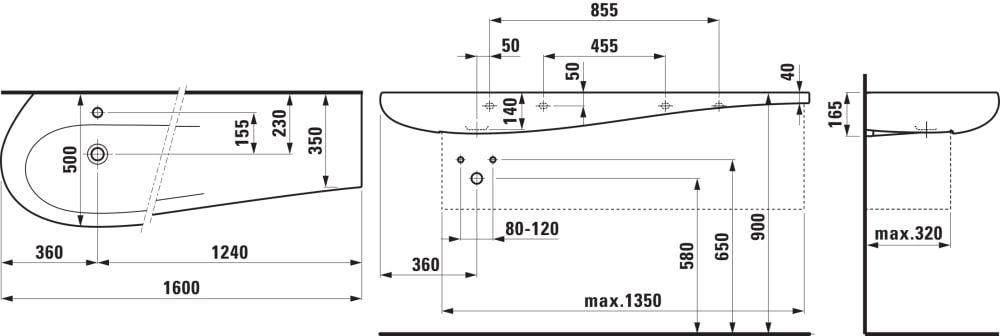 LAUFEN ILBAGNOALESSI Umývadlo do nábytku, asymetrické, odkladacia plocha vpravo s jedným otvorom pre batériu uprostred s prepadom, 1600x500 mm, farba Biela LCC, H8149714001041