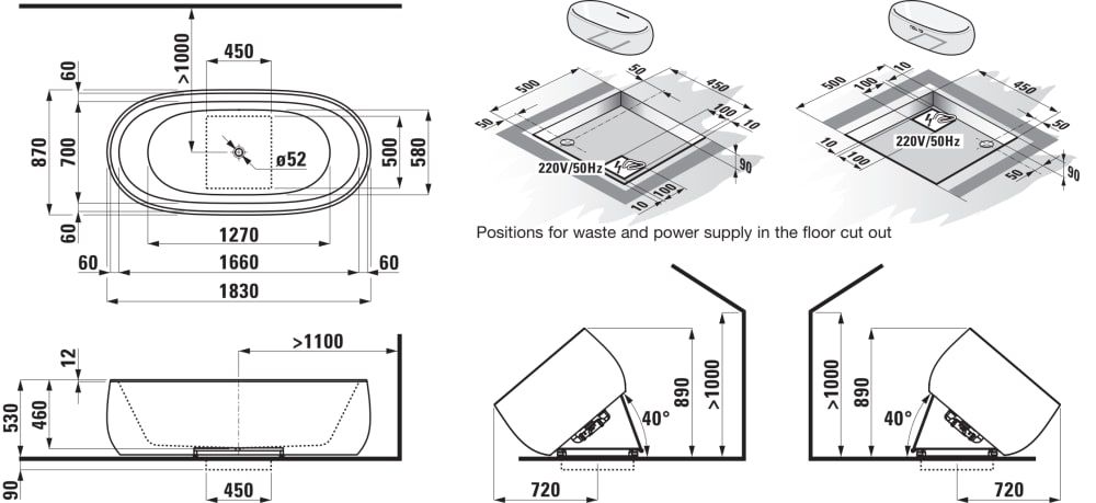 LAUFEN ILBAGNOALESSI Vaňa, solid surface, 1830 x 870 mm samostatne stojaca, s konštrukciou pre uľahčenie montáže, 1830x870x460 mm, H2459720006151
