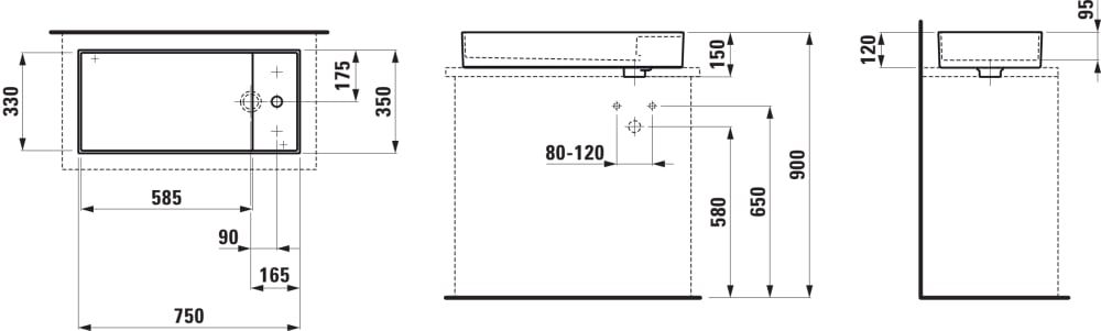 LAUFEN Kartell LAUFEN Umývadlová misa s plochou pre armatúru, so skrytým odpadom s jedným otvorom pre batériu, bez prepadu, SaphirKeramik, 750x350 mm, farba Biela LCC Active, H812332A001111