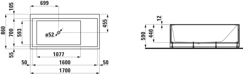 LAUFEN Kartell LAUFEN Vaňa, ľavý roh, s L-panelom pravým, materiál Sentec, s plochou pre armatúru, s prepadom na čelnej strane, s nohami, 1700x860x440 mm, H2243360006161