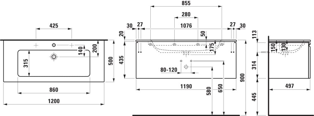 LAUFEN LAUFEN PRO S Umývadlo so skrinkou s 2 zásuvkami, 1200x500x460 mm, Biela 463, H8609674631071