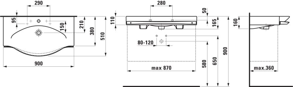 LAUFEN PALACE Umývadlo s držiakom na uterák s tromi otvormi pre batériu s prepadom, 900x510 mm, farba Biela, H8127020001081 Čítať viac