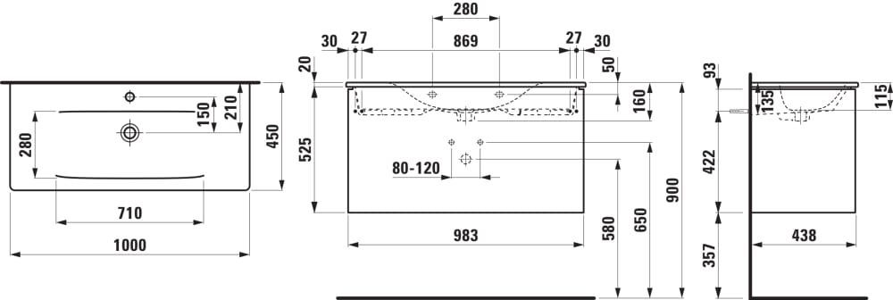 LAUFEN PALACE Umývadlo slim so skrinkou 100 cm, s 2 zásuvkami, vr. deliaceho systému do zásuviek, úchytka z eloxovaného hliníka (lesk), 985x450x530 mm, Biela matná 260, H8607072601041