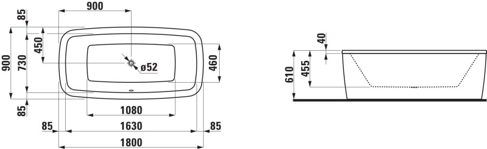 LAUFEN PALOMBA COLLECTION Vaňa, samostatne stojaca s konštrukciou a vonkajším opláštením, objem 170 l (okraj vane 40 mm), 1800x900x455 mm, H2318000000001
