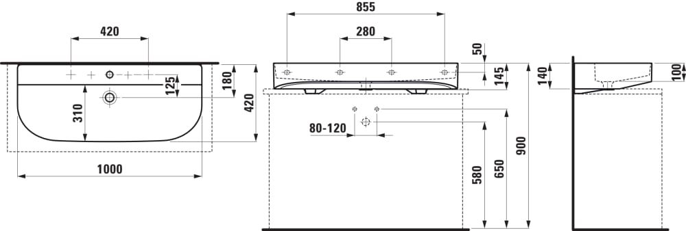 LAUFEN SONAR Umývadlo, brúsená spodná hrana s tromi otvormi pre batériu, bez prepadu, SaphirKeramik, 1000x420 mm, farba Biela, H8163470001581