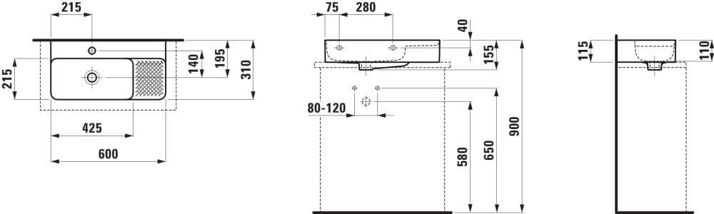 LAUFEN VAL Umývadlo, compact, brúsená spodná časť, so zníženou odkladacou plochou s reliéfom vpravo, 600x310 mm, Biela LCC Active A00, H817285A001041