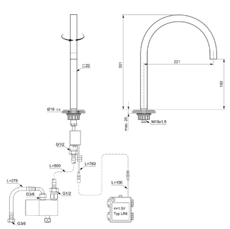 Solos umývadlová batéria 1 otvorová. kapacitný senzor pre automatické otváranie a zatváranie pri detekcií riky. Otočný trubkový výtok štvorcového dizajnu. Cache perlátor 5L/min. Bezpečnostný časovač uzatvára prietok vody po 30 sekundách. Bateriový boc pre 4x1,5V LR6 alkalickú batériu. Nastavenie detekcie na bateriovom boxe pre (Nastavenie citlivosti od 0-5 tovrenské nastavenie je 0, aktivácie režimu čistenia, dlhá aktivácia splachovania). LED indikátor umiestnený na batériovom boxe bliká, keď je produkt zapnutý kvôli kalibrácií alebo ak sú batérie vybité a je potrebné ich vymeniť.  Flexibilné hadice G3/8". Povrchová úprava  biela.  Ideal Standard mikro termostat pre reguláciu  vopred namiešanej vody. Možno kombinovať s vybranými keramickými umývadlami Solos s 1 otvorom pre batériu.