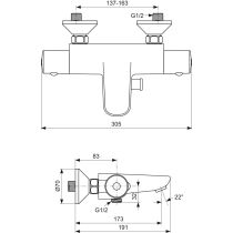 CeraTherm 50 vaňová termostatická batéria nástenná DN 15 so zariadením na zamedzenie spätného toku. 100% Cool Body technológia. Perlátor. Vývod 173 mm. Skryté S-prípojky s nízkou hlučnosťou (nastavitelné od 137 - 163 mm). Kovová nástenná rozeta s tesnením. Automatický prepínač zo sprchy do vane. Kartuša s keramickými diskami. Regulácia teploty s ochranou proti opareniu. Obmedzovač teploty (detská poistka). Blokovacie Eco tlačítko k obmedzeniu prietoku vody. Ochrana proti hluku DIN 4109, trieda 1.