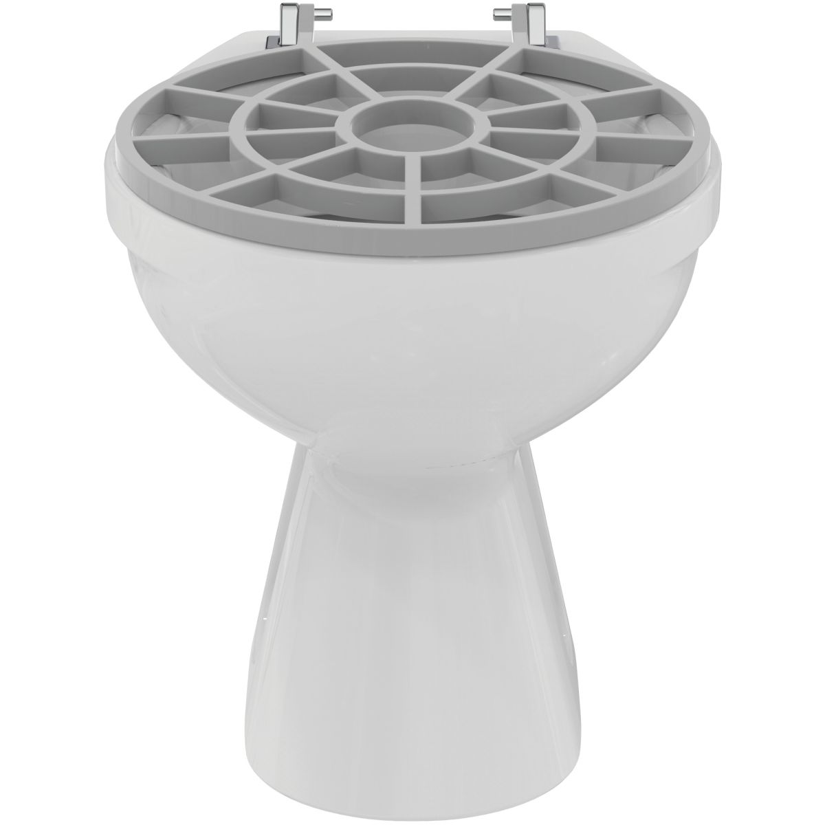 Eurovit výlevka stacionárna z keramického črepu Podľa normy EN 997. Odtok vodorovný. Pre podomietkovú alebo nadomietkovú nádržku so splachovacou kapacitou 6 litrov alebo podomietkový tlakový splachovač 3/4". Upevnenie 2 skrutky M6x70 mm, nie su súčasťou dodávky. Dodáva sa bez mriežky.