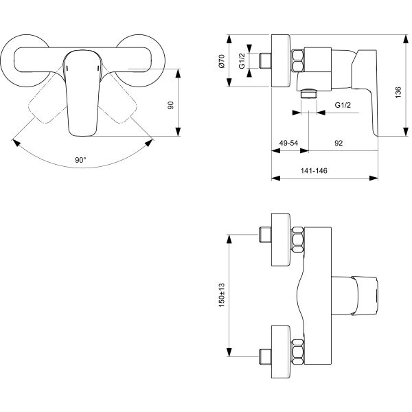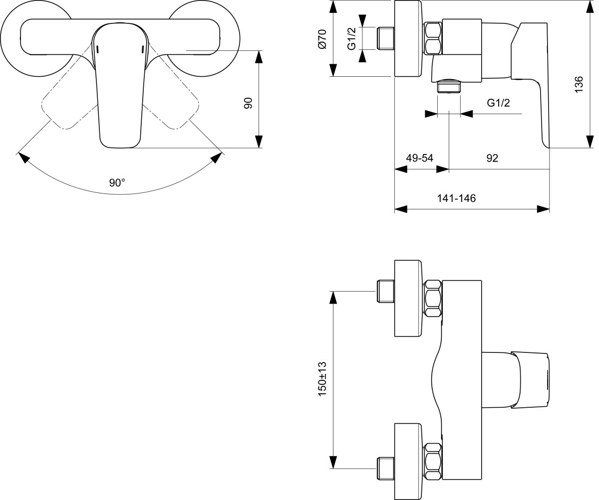 CeraPlan III sprchová batéria nástenná DN 15. So zariadením na zamedzenie spätného toku. Skryté S-prípojky s nízkou hlučnosťou (nastaviteľné od 137-163 mm). Kovová ovládacia páka.  CLICK-kartuša Ø 47 mm s keramickými diskami. Pivot kartuše z nerezovej ocele. Rozsah otáčania páky 120°. Integrovaný zásobnik maziva (vhodné pre potravinárske použitie). Integrovaný obmedzovač teplej vody + ECO funkcia. Životnosť testovaná podľa EN 817. Ochrana proti hluku DIN 4109, trieda 1.