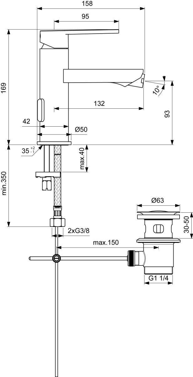 GIO bidetová batéria DN 15. Pevný vývod a perlátor. S odpadovou garnitúrou G1 1/4. Vývod 132 mm. Výška vývodu 93 mm. S flexibilnými hadicami G3/8. Kovová ovládacia páka. Montáž zo spodu - upevnenie EASY FIX s centrovacím a tesniacim krúžkom. Kartuša Ø 35 mm s keramickými diskami. Integrovaný obmedzovač teplej vody. Životnosť testovaná podľa EN 817. Ochrana proti hluku DIN 4109, trieda 1.