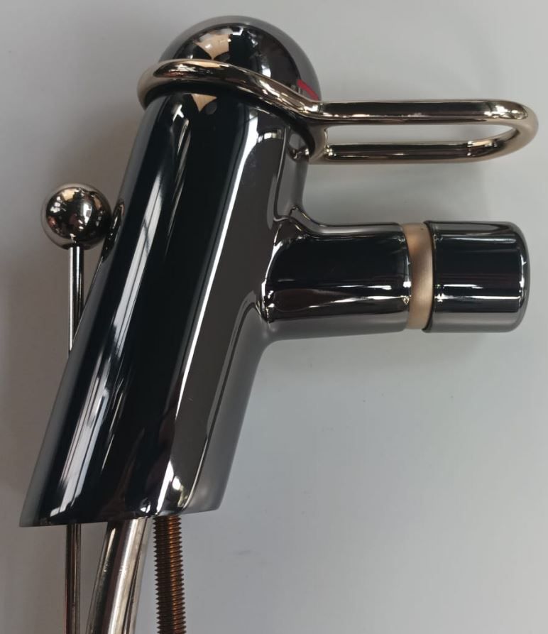 Ceratop bidetová batéria s odpadovou garnitúrou a pevnými medenými trubkami. Pevný vývod a perlátor. Kovová ovládacia páka. Montáž zospodu - upevnenie EASY FIX. Kartuša Eko keramickými diskami pre úsporu energií.  Povrchová úprava Aranja Edelmessing bicolor.