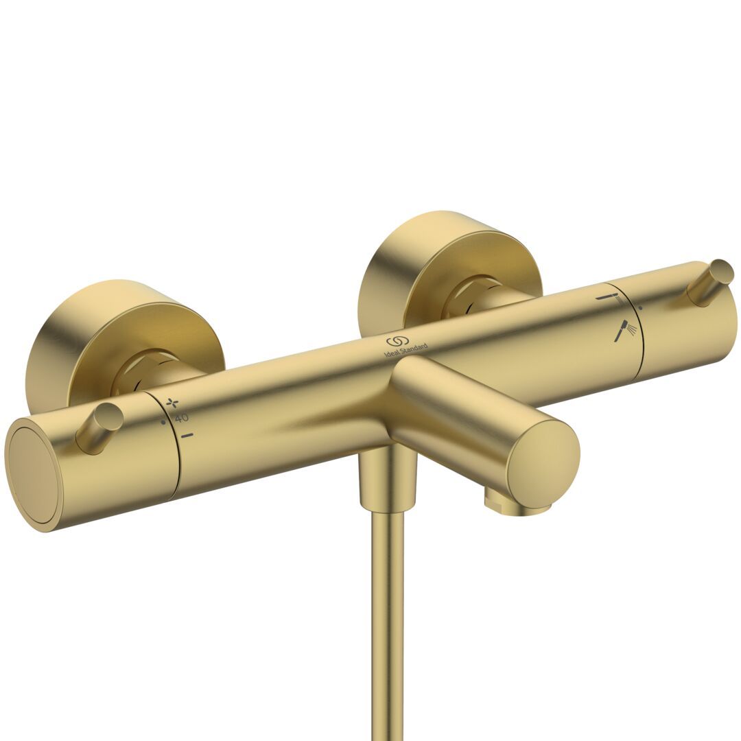 CeraTherm T25 vaňová nástenná termostatická batéria farba povrchu PVD kartáčované zlato. DN 15. So zariadením na zamedzenie zpätného toku. Vývod 161 mm. Nová termostatická kartuša s vylepšenou technológiou nastavenia a kontroly teploty vody, regulácia teploty vody a ochrana proti obareniu. Štíhlejšie telo batérie Ø 41 mm so zdokonalenou technológiou CoolBody, vďaka nej telo termostatickej batérie zostane chladné po celom povrchu. Skryté S-prípojky s nízkou hlučnosťou (nastaviteľné od 137 - 163 mm). Funkcia AntiKalk - systém proti tvorbe vodného kameňa. Obmedzovač teplej vody - detská poistka. Kovové ovládacia rukoväte. Ľavá pre reguláciu prietoku i teploty vody, pravá so zabudovaným prepínačom, pre prepínania medzi vaňou a sprchou. V súlade s EN 1111