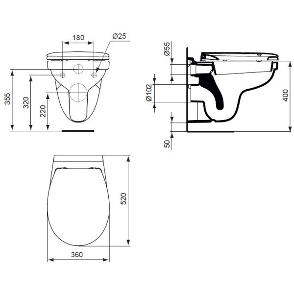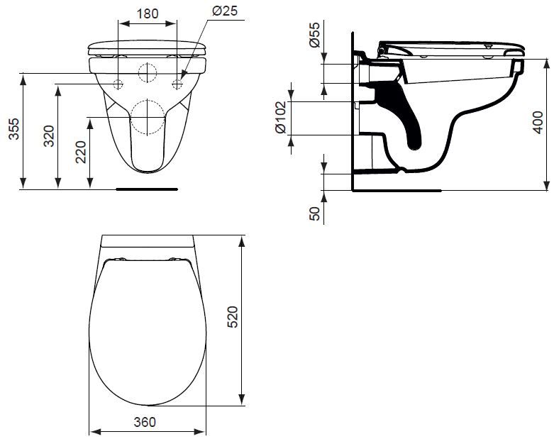WC závesné s hlbokým splachovaním z keramiky. DIN EN 997. Glázované pod kruhom. Pre podomietkovú nádržku so splachovacou kapacitou od 4,5 litrov alebo pre podomietkový tlakový splachovač 3/4“. Upevnenie – 2 skrutky M12 x 150 mm (K710867) do plnej steny najmenej 120 mm alebo s nosným rámom do ľahkých tehlových a sadrokartónových priečok.