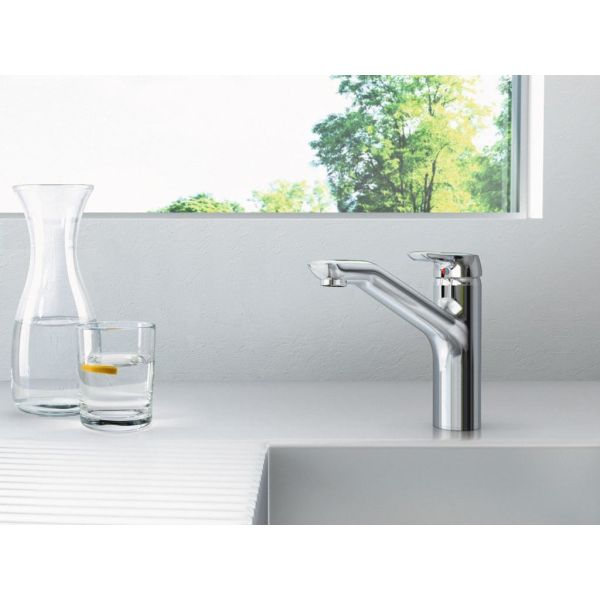 Ceramix Blue drezová batéria s otočným vývodom, DN 15. Technológia Ideal Pure - oddelené vodné cesty zo špeciálnych plastov eliminujú vyplavovanie niklu a olova z tela batérie a zároveň dochádza k úspore vody a energie. Cool Body technológia. Vývod 238 mm. Výška vývodu 170 mm. S flexibilnými hadicami G3/8. Kovová ovládacia páka, montáž zospodu (tyč so závitom M33 x 1,5). Click- kartuša Ø47 mm s keramickými diskami. Pivot kartuše z nerez ocele. Rozsah otáčania páky 120°. Integrovaný obmedzovač teplej vody s ECO funkciou. Integrovaný zásobník maziva (vhodné pre potravinárske použitie). Životnosť testovaná podľa EN 817. Ochrana proti hluku DIN 4109, trieda 1.
