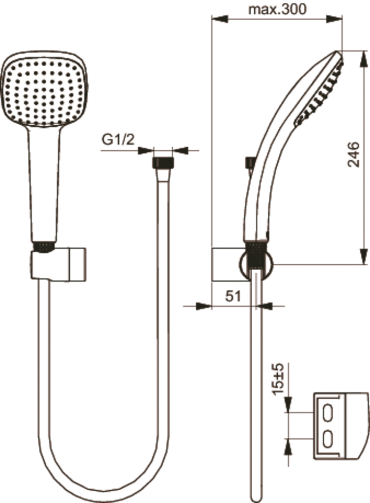 Idealrain Cube M1 sprchová sada 1-funkčná ručná sprcha 10x10 cm. Funkcia Anti-Kalk (proti tvorbe vodného kameňa). Otočný držiak sprchy. Hadica "Idealflex" 125 cm.